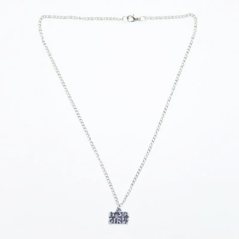 Halsband i form av ett silverfärgat triangel med texten: It’s a girl