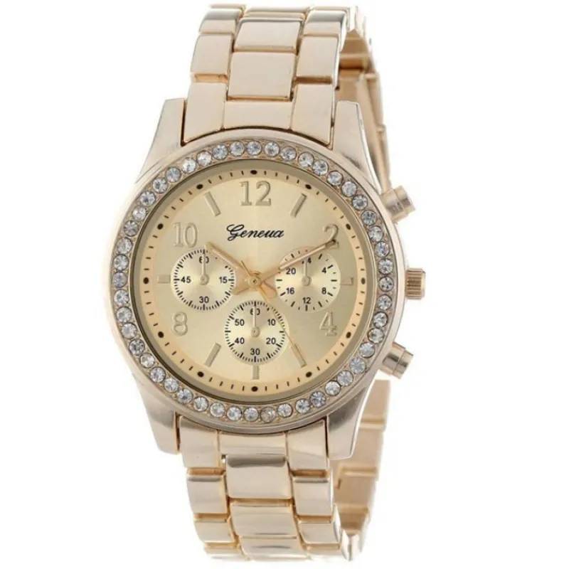 Snygg och exklusiv Geneva klocka i Guldig Klockan är i rostfritt stål och har Japanskt qvartz-urverk och fluoriserande visare. Kronograferna är endast för dekoration. Armband: Länk i rostfritt stål med viklås och dubbla tryckknappar dekorerad med strass Armbandsbredd : 17 mm Diameter: 37 mm