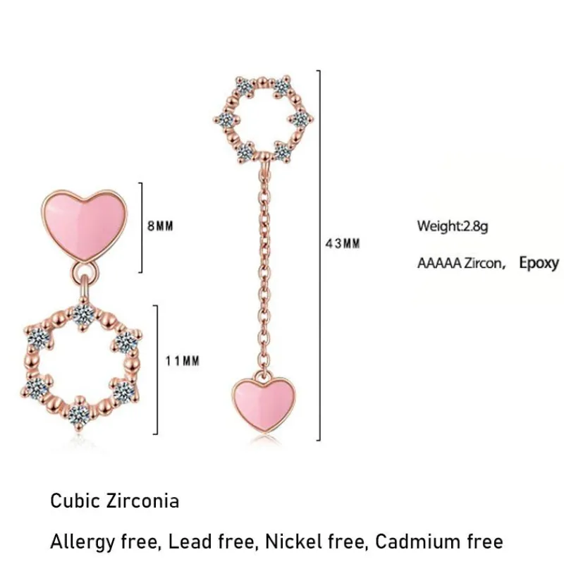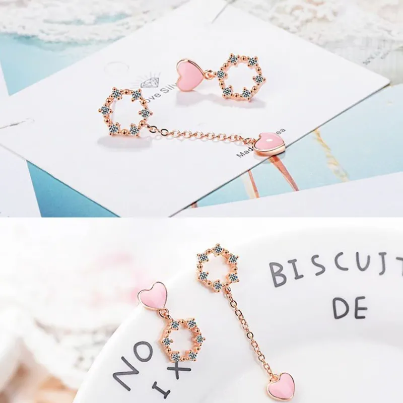 Komplettera din outfit med vackra rosa hjärta Asymmetrical Örhängen 925 Silver zirkonörhängen för kvinnor Örhäng…