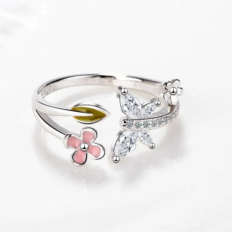 Vacker 925 Sterling Silver / AAAAA Zircon Butterfly Flower open Ring
