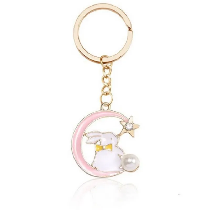 Vit kanin sitter på halvmåne stjärna och pärla nyckelring med Frifrakt