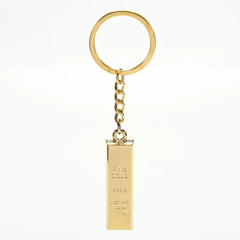 En jätte fin guldig nyckelring ser ut som en liten gold brick