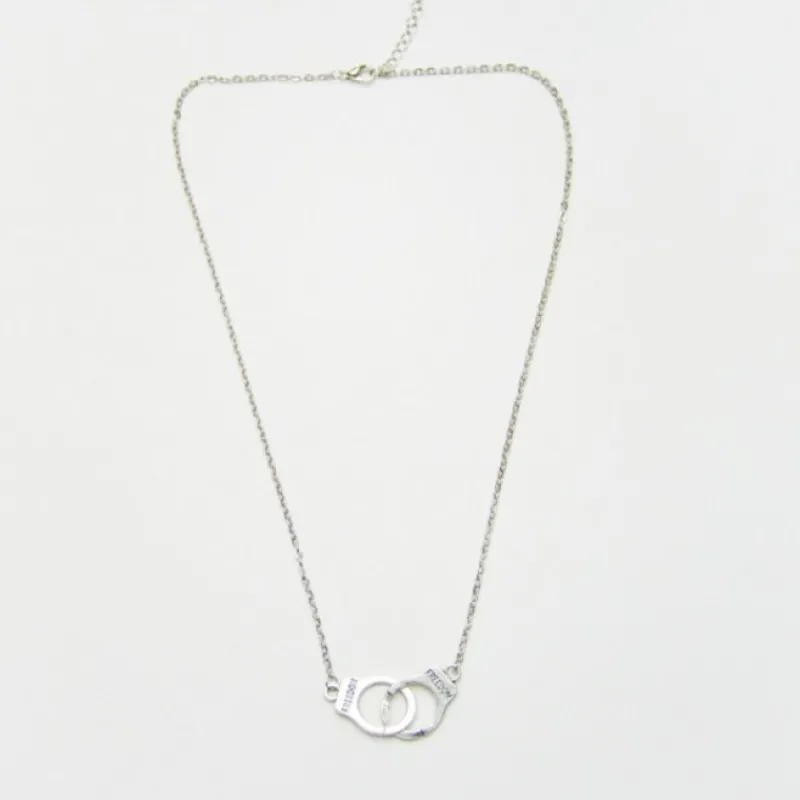 Halsband som ser ut som handbojor med ordet freedom skrivet på båda handbojorna. Halsbandet är stilrent men ger ändå ett budskap. Handbojor freedom halsband är tillverkat i silverpläterad legering.