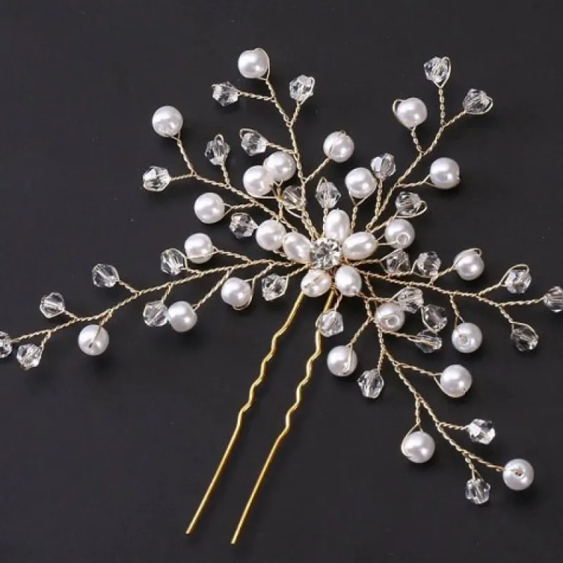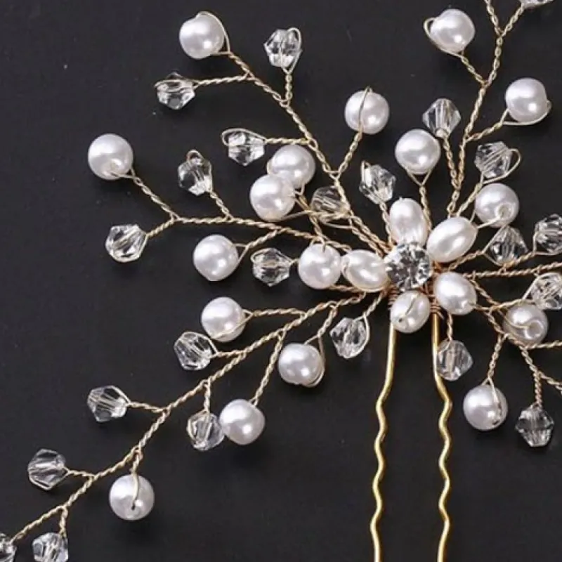 Sex kvistar Hårnål med glasstenar och plastpärlor – Damer Söt Pärla Hårnålar med Strass guldig